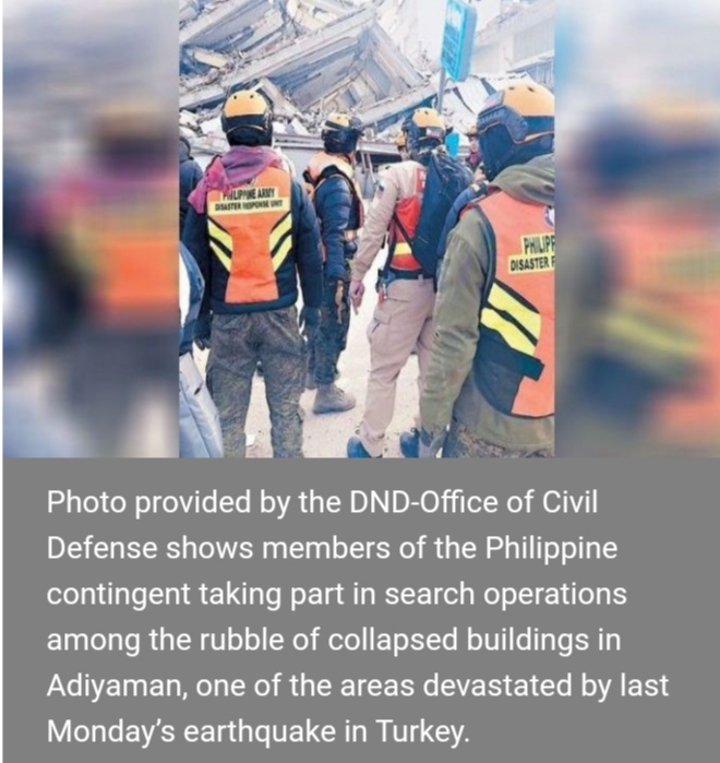 Meanwhile in Manila, Department of National Defense (DND) Secretary Carlito Galvez Jr. thanked the Japanese government for its donation of training and equipment for search and rescue to the Philippine Army’s 525th Engineer Combat Battalion who are part of the contingent sent to Turkey to assist in the daunting task of locating survivors.