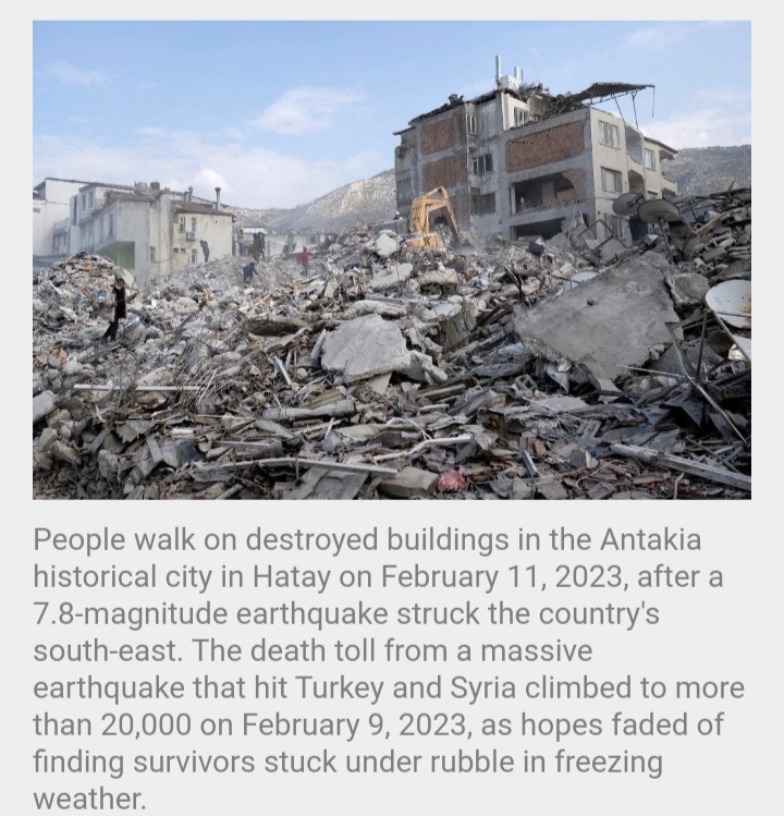 People walk on destroyed buildings in the Antakia historical city in Hatay on February 11, 2023, after a 7.8-magnitude earthquake struck the country’s south-east. The death toll from a massive earthquake that hit Turkey and Syria climbed to more than 20,000 on February 9, 2023, as hopes faded of finding survivors stuck under rubble in freezing weather.