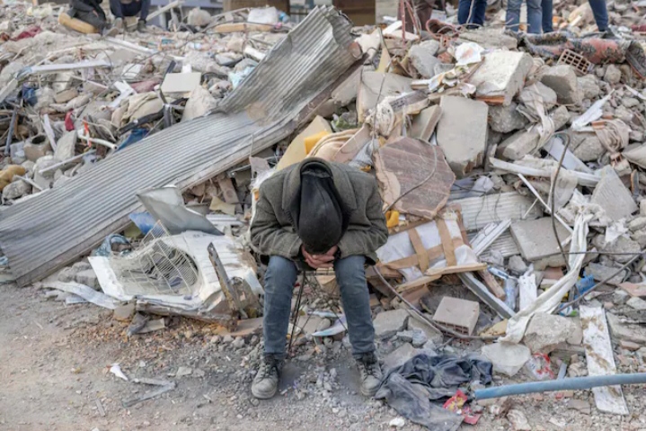 A man sits on the rubble of a collapsed building during rescue operations in Hatay, Turkey, on Sunday after last week’s earthquakes. (Bulent Kilic/AFP/Getty Images)